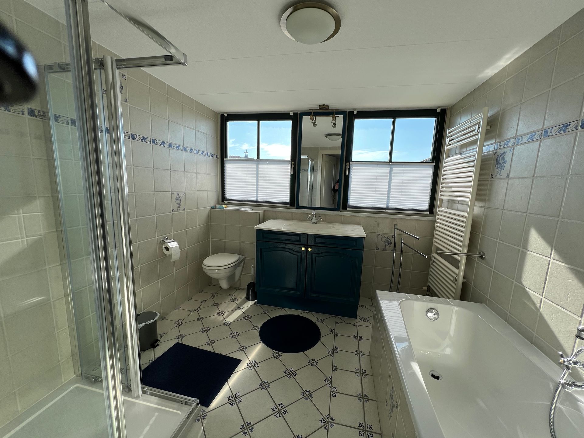 Im Obergeschoss finden sich zwei geräumige Schlafzimmer mit einem französischen Bett und zwei Einzelbetten und das große Bad mit Dusche, Badewanne, Waschtisch und Toilette.