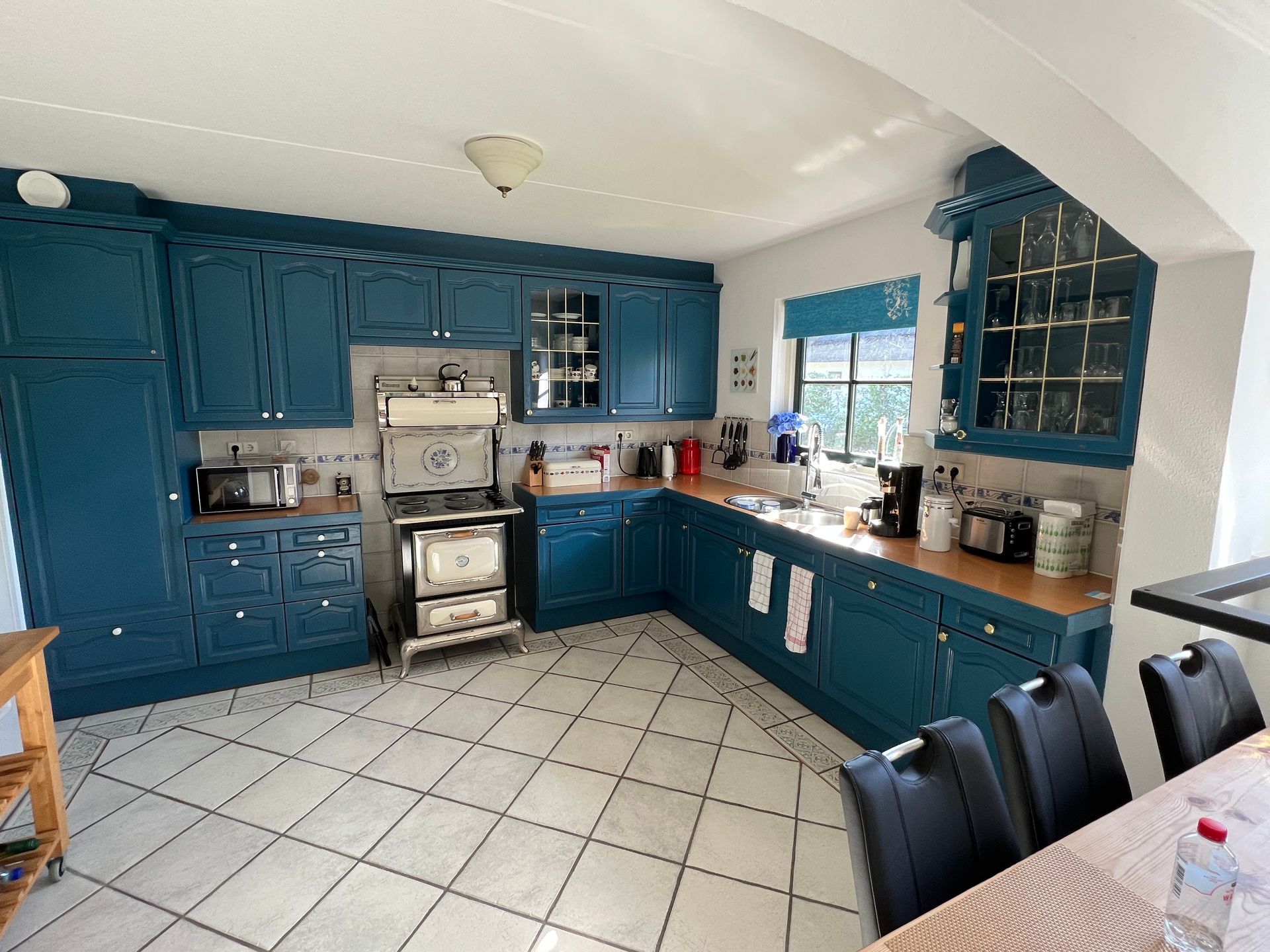 Die große offene Küche ist mit einem Induktionsherd mit Backofen, Kühlschrank mit Eisfach, Mikrowelle und einer Spülmaschine ausgestattet. Kaffeemaschine, Toaster, Heißwasserbereiter sind ebenso selbstverständlich wie ausreichend Gläser, Besteck, Geschirr, Töpfe u.s.w.
